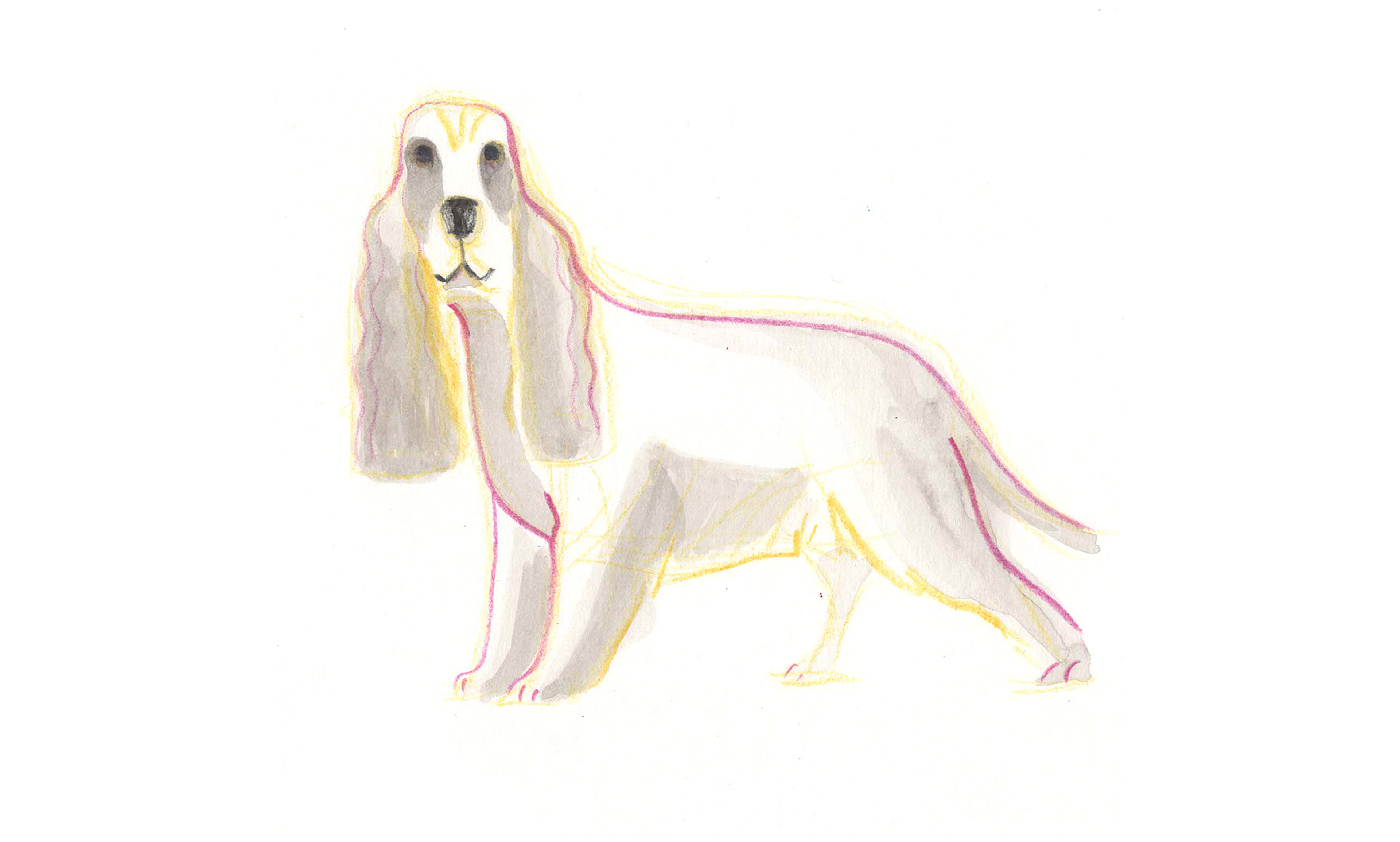 A series of ink and pencil sketches of dogs. The drawings are created using pencils and pastels. This practice allows for exploring traditional techniques and new artistic languages beyond the usual ones used in the field.