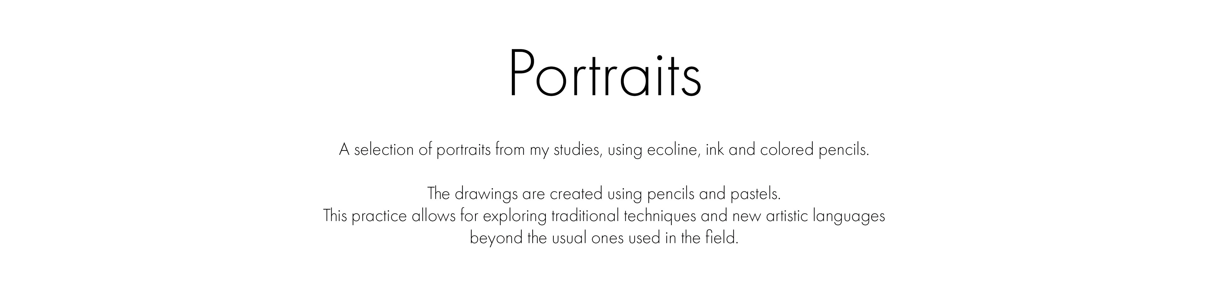 A selection of portraits from my studies, using ecoline, ink and colored pencils. The drawings are created using pencils and pastels. This practice allows for exploring traditional techniques and new artistic languages beyond the usual ones used in the field.